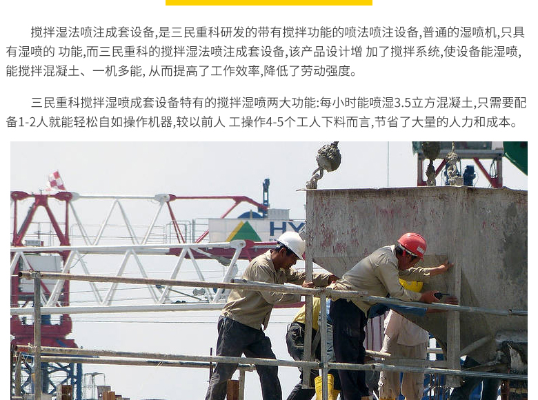 簡介:三民重科攪拌濕噴成套設(shè)備特有的攪拌濕噴兩大功能:每小時能噴射3.5立方混凝土,只需要配備1-2人就能輕松自如操作機器,較以前人工操作4-5個工人下料而言,節(jié)省了大量的人力和成本。